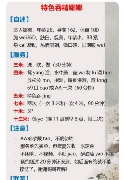 一个少妇,态度很好不催人,服务是真做一直做啊。特色服务很多,野战,倒立红绳等,还可以带出去KTV,这些。 ...
