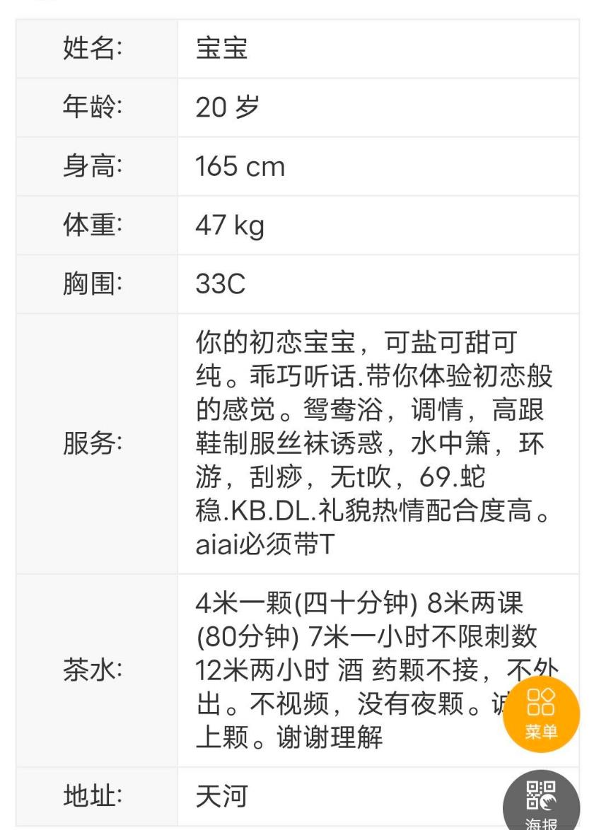 照片和真人差不多,皮肤白净净。年龄不大,03年的妹子,圆润小脸蛋,至少长相过关。身材标准165高,地方是 ...